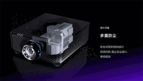 比如真空密封激光模組,從光源到DMD芯片及棱鏡間的全封閉光路設(shè)計(jì),還有在各連接位透過(guò)防塵海綿、防塵橡膠或聚脂薄膜等多種材料構(gòu)筑起層層保障,最終為核心光學(xué)元件創(chuàng)造出超越IP5X等級(jí)的防塵效果。