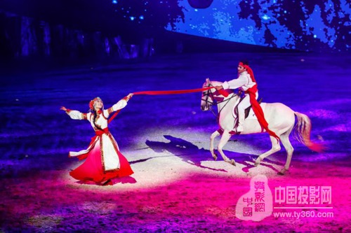 贏康設計的投影系統真實還原了草原、火山、沙地、雪地、日出、月落等自然場景。同時,針對舞臺中央的馬頭建筑、雪山幕布等舞臺背景,單設了一組投影機,配合布景的變化,投影機進行靈活切換,讓布景與劇情充分融合,將整場表演推向高潮。