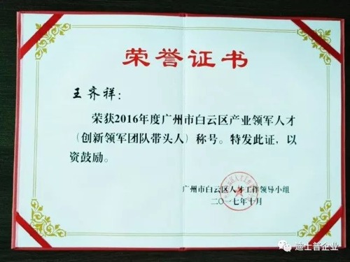 企業(yè)良好的發(fā)展離不開正確的指引與規(guī)劃。迪士普信息科技有限公司總經(jīng)理王齊祥先生被 授予“2016年度廣州市白云區(qū)產(chǎn)業(yè)領(lǐng)軍人才(創(chuàng)新領(lǐng)軍團(tuán)隊(duì)帶頭人)稱號”, 以表彰他對白云區(qū)的創(chuàng)新、創(chuàng)業(yè)工作作出的突出貢獻(xiàn)。