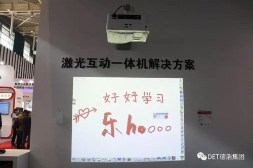 作為DET重磅推出的智能會議/教育協(xié)作多媒體組合方案,DET-T1與DET-TOUCH1的展示最為引人駐足。DET-T1超短焦超寬屏,采用DLP激光技術(shù),亮度高達3600流明。DET激光光源壽命高達20000小時,基本達到免維護,即使長時間作業(yè)也無妨。激光光源起到保護學(xué)生眼睛的作用,即使長時間使用也不會感覺視覺疲勞,是學(xué)校教育設(shè)備的首選。