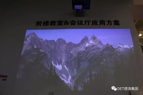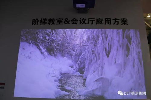 鑒于市場上普遍都是用工程機投影解決階梯教室與會議廳的對大畫面的需求,此次DET“另類”地展示了超短焦激光工程DET-C5,表達了一種觀念,就是會根據(jù)客戶的實際需求提供不同類型的解決方案,創(chuàng)造顯示價值。DET-C5,理論值可以投影80-150寸畫面。本次展會超短距離41.7cm即可投影120寸大屏幕,亮度3600流明,支持1080P全高清畫質(zhì),畫質(zhì)細膩出眾。