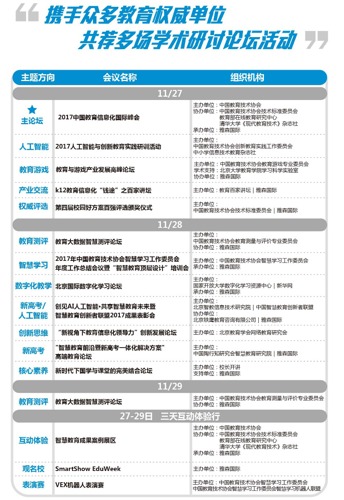 國際智慧教育展除了年末的大型專業(yè)展覽外,還將與50余家行業(yè)權威單位共同打造貫穿教育信息化產業(yè)鏈全維度的二十余場論壇會議活動,其中涵蓋有聯通體制內外融合的主題論壇,以及從“教育+”人工智能、游戲、測評、智慧學習、數字化教學、新高考、創(chuàng)新思維、核心素養(yǎng)、創(chuàng)客&STEM等多維度方向的高峰論壇及學術研討會。