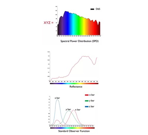 XYZ值是通過將以下三個(gè)屬性相乘構(gòu)成的:光源的光譜功率分布、目標(biāo)對(duì)象的反射率,以及用于描述人類視覺系統(tǒng)特性的標(biāo)準(zhǔn)觀察者函數(shù)。