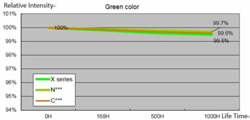 這種艾比森自主研發的燈珠,紅/綠/藍燈平均亮度為2200mcd/5200mcd/880mcd,而日亞燈的紅/綠/藍平均亮度只有1600mcd/3400mcd/750mcd;同時,A1699相比以往,紅燈亮度提升125%,這意味著消耗同樣功耗的屏體,亮度變得更高。燈在光衰測試中,A1699的表現也非常出色 ,R/G/B的1000小時高溫衰減實驗中顯示為零衰減。