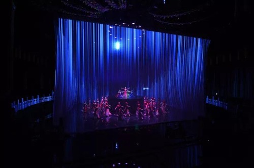 據了解,舞臺上共配置了20臺31,000流明的松下工程投影機,其中8臺垂直安裝于舞臺頂部用于投射舞臺地面,12臺吊裝在棚頂四周投射環繞在舞臺中央的紗幕。