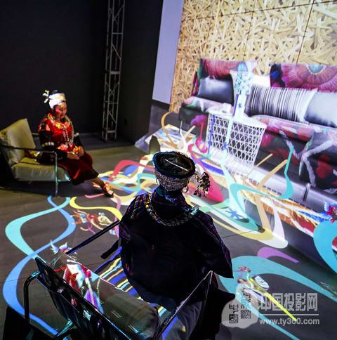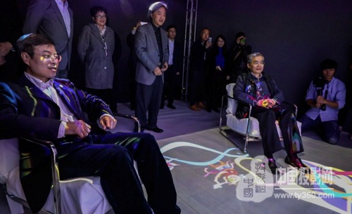 文化部項部長和全國人大代表、上海大學金校長在參觀展覽時,對沉浸體驗的展項贊不絕口。這兩位特別的參觀者分別坐在不同的椅子上,根據展項的指導分別體驗了單人、雙人眾多的場景,眼前的墻面展示的是一個現代簡約風格的臥室場景,而鋪在腳底下的可能是非遺文化中的傳統苗繡。兩位領導表示,不同時代和風格的元素融合在一起,用最新的激光顯示技術營造出的沉浸體驗空間,參觀者置身其中,也正體現了“非遺走進現代生活”展覽主題。