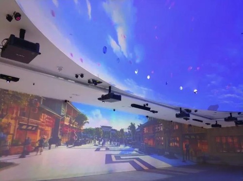 作為八爾湖風景區(qū)的門面,如何能讓游客在展示大廳中就能身臨其境地感受到八爾湖的水勢安穩(wěn),樹木繁復,風景秀美,這就需要NEC工程師的精心設計。工程師們使用25臺NEC PX803UL-BK+及2臺NEC PX1004UL-BK+高端工程投影機,利用豎投、融合、球幕等不同的投影展示技術營造出了極為逼真的360度沉浸式空間。