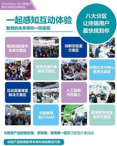 2017中國國際智慧教育展覽會將于12月15~17日于北京•國家會議中心隆重開幕。實力升級的SmartShow 2017將全面覆蓋4大展館,展覽面積達40000平方米,8大熱點分區實力展示未來教育改革趨勢,零標展特色展區規劃將為400余家精選教育品牌企業提供更優質實效的展示平臺,為萬所院校呈現助力智慧教學的前沿信息化科技產品。