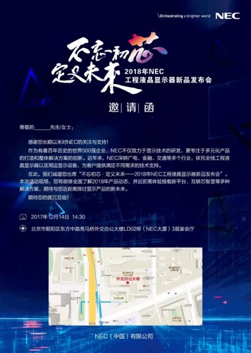 12月14日“不忘初芯•定義未來——2018年NEC工程液晶顯示器新品發(fā)布會(huì)”,誠邀您蒞臨現(xiàn)場,和NEC一起交流產(chǎn)品理念,探討未來發(fā)展,共同探索并打造具有劃時(shí)代意義及充滿未來感的新應(yīng)用。