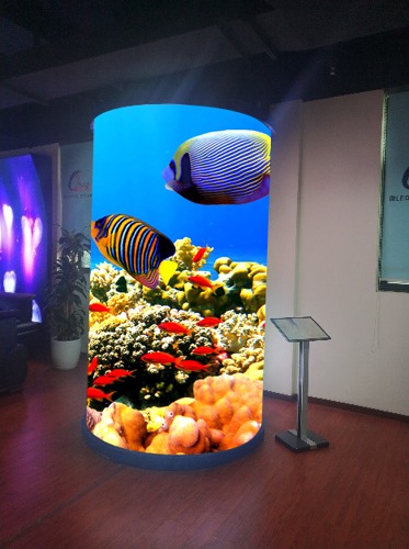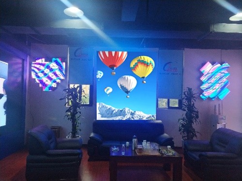 更值得一提的是展廳中五彩繽紛的異形屏。會(huì)客區(qū)一側(cè),中間的弧形屏與兩側(cè)的多邊形異形屏相得益彰;展廳中間,柱形屏和方形屏氣勢(shì)磅礴,讓整個(gè)展廳熠熠生輝。各種LED創(chuàng)意異形屏千姿百態(tài),以其獨(dú)特的產(chǎn)品造型和特有的定制化、個(gè)性化,為客戶帶來(lái)不一樣的顯示體驗(yàn)。