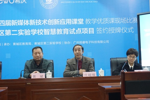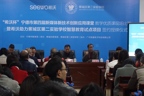 借此契機,蕉城區第二實驗學校與視睿科技舉行了“希沃助力蕉城區第二實驗學校智慧教育試點項目簽約授牌儀式”。寧德市教育局黃斌調研員、蕉城區教育系統黨委莊超端副書記、寧德市電化教育站林向英站長、蕉城區第二實驗學校黃云周校長、各參賽教師及希沃相關代表出席了簽約授牌儀式,共同見證這個重要時刻。
