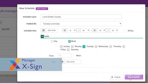 X-Sign播放端提供多個系統平臺版本,可通過連接明基云服務器或線下USB接收內容并播放。當門店數量少或網絡不穩定時,可選擇單機版的U盤直讀,將U盤插入數字標牌設備即可自動讀;而網絡版適宜連鎖經營模式,通過軟件管理端進行內容排程與分發,再到云服務器統一遠程播放,避免了人為犯錯。
