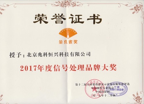2017年視聽行業高峰論壇同期還舉行了第十二屆中國大屏幕投影行業年度評選頒獎典禮,經過專家組、評委組、網上投票等多種方式層層篩選,在上千家候選企業中,最終評出2017年金孔雀獎,兆科榮獲“2017年度信號處理品牌大獎”,這是繼2016年榮獲第十一屆中國大屏幕投影行業年度信號處理品牌大獎后,再獲此殊榮。