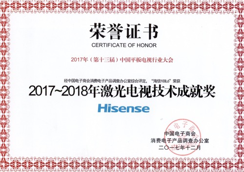 12月18日,中國電子商會、中國電子技術標準化研究院聯合舉辦了 “2017年中國平板電視行業大會”。海信激光電視、ULED電視在引領彩電技術升級和推動高端市場增長方面做成的突出貢獻受到行業專家的充分肯定,海信4K激光電視機100L6獲得“2017-2018年激光電視技術成就獎”、海信ULED超畫質電視HZ75U9A獲得“2017-2018年十大精品電視”大獎。