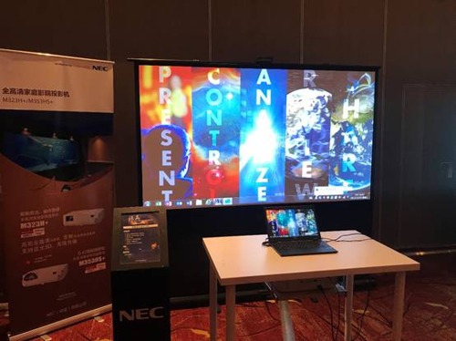 為了滿足越來越多商務(wù)辦公的智能化需求,包括NEC CF6600W、CF6700X、CF6500X等新品在內(nèi)的3款產(chǎn)品,具有NEC MultiPresenter智能協(xié)作軟件。巡展現(xiàn)場,通過電腦、平板和手機接入MultiPresenter軟件進行無線互聯(lián),用全高清激光投影機投射出來,實現(xiàn)了無線投影、多畫面顯示、網(wǎng)頁分享、投影控制等功能。此外,智能協(xié)作軟件還具備非常靈活的顯示方式,可以同時連接50臺設(shè)備,最多支持4*4的16畫面同時顯示,避免了會議時精彩創(chuàng)意無法被迅速分享的尷尬,讓每個與會者都能參與其中。