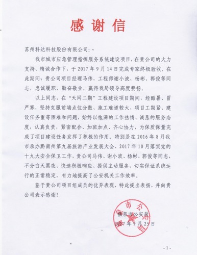 共建平安,智慧福泉。2017年9月14日,福泉市“天網二期”建設項目通終極驗收,專家組給予很高的評價:“福泉市‘天網工程’建設起步晚、推進快、質量高、效果好。”美麗黔南自此有了一張安全新名片。
