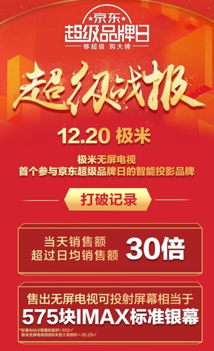 作為京東最重大的節(jié)點(diǎn)之一,京東超級品牌日結(jié)合了京東營銷能力、大數(shù)據(jù)能力、運(yùn)營能力和金融能力等,是京東高品質(zhì)、強(qiáng)大電商能力的集中呈現(xiàn)。對于品牌商而言,超級品牌日不僅可以拉動品牌在京東的銷售,還能加強(qiáng)用戶對品牌的認(rèn)知。此前參加京東超級品牌日的企業(yè)多是三星、聯(lián)想、戴爾、美的等知名消費(fèi)電子企業(yè)。在投影行業(yè),極米無屏電視是截止目前唯一一個(gè)獲此機(jī)會的品牌,可以說是開創(chuàng)了行業(yè)先河。