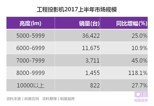 2017年上半年工程投影銷售仍以5000-5999流明機型為主流,銷量達(dá)到36,422臺,占該品類銷售份額67%;而總體工程投機半年銷量總計達(dá)到54,105臺,同比增長24.4%,相較于整體投影機市場增幅的3倍左右,表現(xiàn)出良好勢頭。