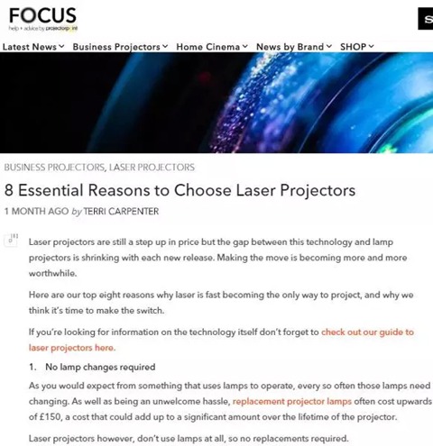 英國投影產(chǎn)業(yè)媒體《FOCUS》整理「激光投影機8項基本優(yōu)點」,包括: