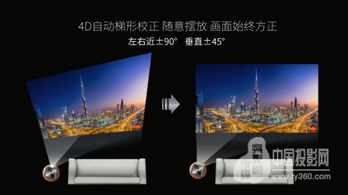 在4D自動梯形校正之前,國內(nèi)智能投影只能做到垂直自動校正(上下方向)