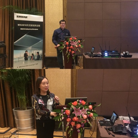 舒爾中國系統集成高級工程師李菁京為現場嘉賓展示了具有舒爾獨特技術的網絡矩陣話筒Microflex Advance系列產品,和舒爾具有高度穩定性和安全性的數字無線系統,并分享舒爾系統安裝產品在全球的成功案例。同時在第二會場搭建了舒爾天花板矩陣話筒MXA910和桌面矩陣話筒MXA310,接入實際會議環境并將音視頻信號傳入主會場互動,聲音效果和會議模式得到在場嘉賓的一致認可。在茶歇階段來賓們紛紛參觀了分會場即實際會議場景,集成商和用戶對于功能多樣,準確覆蓋不同規模的會議的舒爾音頻產品表現出濃厚興趣。