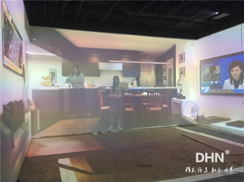 整個現場搭配7000流明工程投影機,選用11臺DHN—DX432、1臺DHN—DW705邊緣融合器,實現多臺融合大畫面。以8通道沉浸式板塊為例,左右墻分別長4.4m ,高3.6m,中墻長7m高3.6m。根據其要求,墻面與地面皆用投影來實現,播放視頻時,墻地必須同時進行,實現墻地聯動效果。根據這一要求,我司給出“選用8臺標清投影機,分別左右墻一臺,中間墻兩臺,地面配置四臺投影機,搭配DHN系列邊緣融合器”,實現墻、地畫面無壓縮融合,打造沉浸環境,營造全方位、立體的身臨其境感。