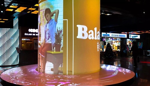 比起頭頂和腳下的暗藏玄機,最吸引人的莫過于中間的曲面光柱,隨手一拍自帶未來感buff加成。2.2米高、直徑1米的圓柱多媒體通過12臺視美樂投影機(SML—PF450)正面投射,自主研發配備電動變焦聚焦鏡頭(1.0-1.7:1投射比的SML—ZL160C),85%的高透過率,亦是國產短焦鏡頭中的翹楚,畫面亮度幾乎無損。投影面積覆蓋光柱體、桌面總直徑長達3米的底部轉盤,無一不清晰細膩的展示整個B1樓入駐商家信息,看著多家首次進駐杭城的網紅美食店的宣傳片,真的是忍不住要歇歇腳,暫時停下來。