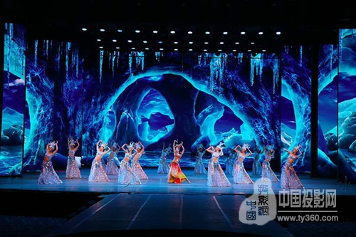 如第一幕“漁水歡歌”中,柔美純凈的音樂響起,符合海洋夢幻神秘的基調(diào),舞美設(shè)計(jì)方面,紗幕投影呈現(xiàn)波光粼粼的海水和激起的水花,LED舞美則同步呈現(xiàn)立體冰川畫面,為女主阿珠營造在深海與水共舞的美妙場景。