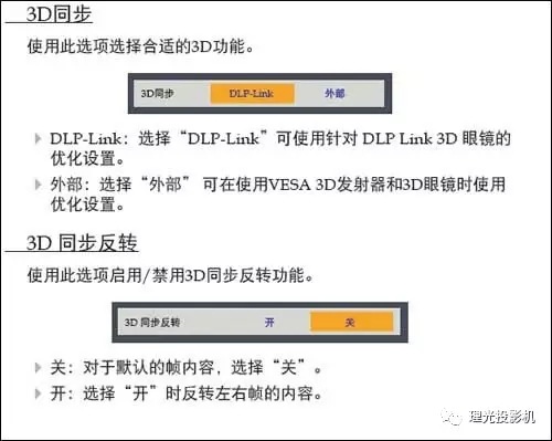 當DLPlink同步信號跟主動式3D眼鏡開始同步時,有時會有左右眼信號相反的狀況,使用者開啟3D功能時若發現左右眼信號相反,則只要進入OSD功能表中開啟3D同步反轉功能,畫面即恢復正常,達到最佳的3D效果。