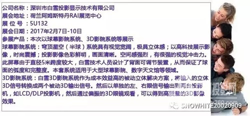深圳市白雪投影顯示技術有限公司將于2017年2月7日至10日參加荷蘭ISE國際視聽及系統(tǒng)集成展,誠邀您現(xiàn)場參觀。