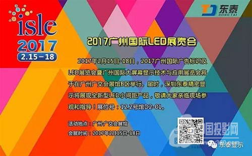 2017年2月15日-18日,廣州國際廣告標識及LED展覽會(ISLE)屆時將在廣州廣交會展館B區舉行,深圳東泰精密顯示技術有限公司將攜多款全新型小間距產品一展風采!歡迎大家蒞臨現場!展位號:12.2號館D2-01。