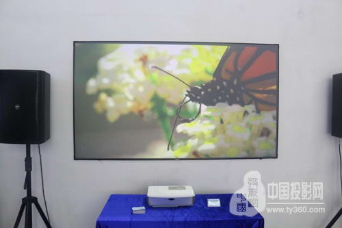 從現(xiàn)場圖片可見,即使DET-C6投射到白墻上,效果也非常顯著哦!DET-C分辨率達1080P,畫質(zhì)優(yōu),超短焦也節(jié)約客廳空間。