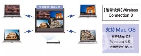 通過配套的無線路由器,可與windows®PC進行無線通信(IEEE802.11b/g)。可4臺同時投影(四分之一畫面),共可連接8臺。