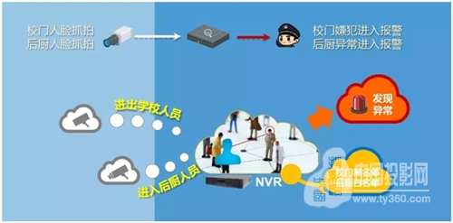 通過部署在校門/食堂后廚的人臉抓拍機,利用人臉識別比對的技術,結合人臉名單庫,可以自動篩選前來鬧事或者無權進入后廚的異常人員,第一時間發出報警提示校保安進行處置,將事故終結在發生之前。