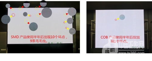 ①性能更可靠。沒有了燈珠封裝、回流焊、貼片等工序的COB小間距LED產品,其本身穩定性大大提升,并能有效避免傳統SMD封裝壞點越來越多的缺陷。經測算,大約在使用半年后,采用COB封裝技術的小間距LED累積壞點率不到采用SMD技術的十分之一。