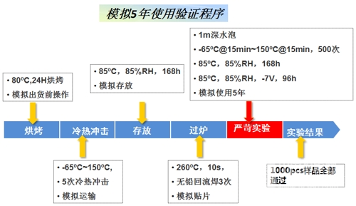 檢驗選材用料、工藝制造的各項檢測實驗:1000小時常溫老化實驗、測試材料結合性能的高壓蒸煮實驗、模擬客戶貼片和高溫低溫迅速轉換的冷熱沖擊實驗、反壓試驗、模擬5年使用驗證程序實驗等,嚴格保證產品品質。