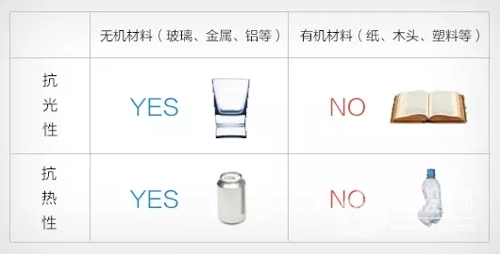 一張圖對比有機和無機材料的抗光性與抗熱性