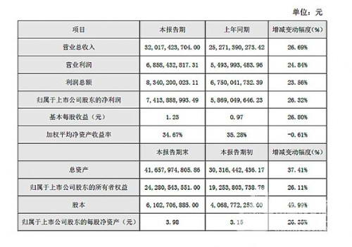 2016年度,公司實現營業總收入32,017,423,704.00元,比上年同期增長26.69%;實現營業利潤6,858,432,817.31元,比上年同期增長24.84%;實現利潤總額8,340,200,023.11元,比上年同期增長23.56%。實現歸屬于上市公司股東的凈利潤7,413,888,993.49元,比上年同期增長26.32%。