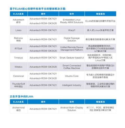 其中,ELAA標準開發平臺伙伴,提供基礎核心硬件平臺以及軟件開發工具包(BSP);硬件差異化服務伙伴,則進一步結合底板設計、系統整合,以提供硬件客制化、差異化服務,進而滿足各式嵌入式或工業物聯網應用對硬件的需求;軟件加值整合服務伙伴,建構在上述兩層的基礎上,開發符合客戶應用所需的嵌入式Linux或Android操作系統,并協助客戶發展其應用所需之軟件加值服務。