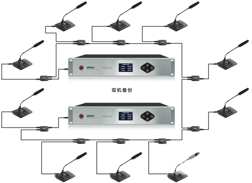 QT-625系列會議話筒為最新一代的數字網絡會議話筒,系統采用標準CAT5網線手拉手模式連接;更為重要的是,此次大會會議系統采用啟拓獨創的“雙機備份”模式,保證了會議系統完美運行。啟拓的雙機備份功能是指會議系統同時由兩臺會議主機同時提供服務,一旦主控機發生故障時,無需人工干預,備用機就將自動接管會議服務,保證會議正常進行!