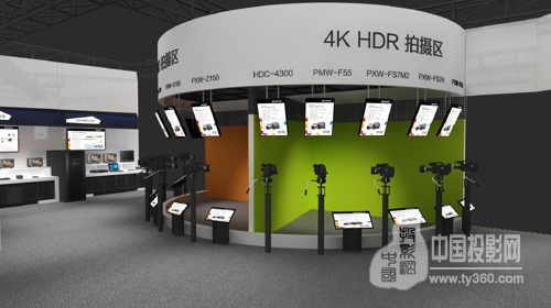 索尼室內(nèi)展臺(tái)分為4K及XDCAM攝像機(jī)環(huán)形拍攝區(qū)、HDR片花展示播放區(qū)、手持一體機(jī)柱式互動(dòng)區(qū),等多個(gè)區(qū)域。