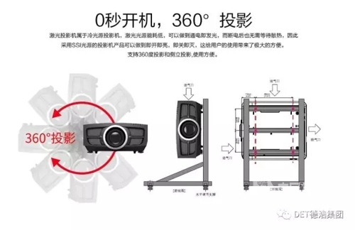DET激光工程投影機,機身輕巧,不僅易于搬運、安裝。同時,支持全360度投影,側立投影;采用全密封光學模塊的抗塵結構,抗棉纖維過濾器抗塵,支持HDBaseT遠距離傳輸。