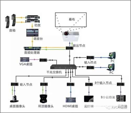 同樣的功能場合,DS3.0分布式系統,架構簡約,DS3.0 輸入輸出節點僅通過一根網線與交換機連接,就能達到整個系統的互通互聯。