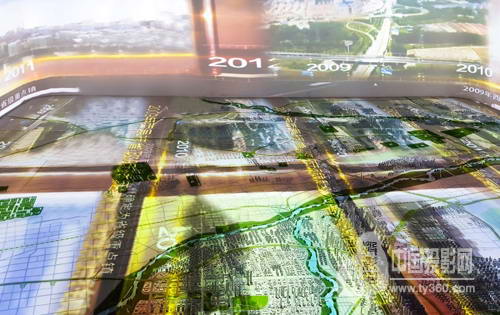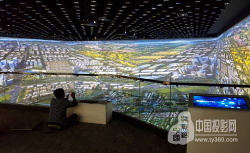 全圍合視角營造沉浸觀影體驗,將地面的區域規劃圖與周圍的三面幕墻打造出一個栩栩如生的影像空間。在沙盤上,可以清晰的看到綠化帶、公路、河流、住宅小區等等,顏色、光影與實物模型的結合讓眼前的一切更顯真實。
