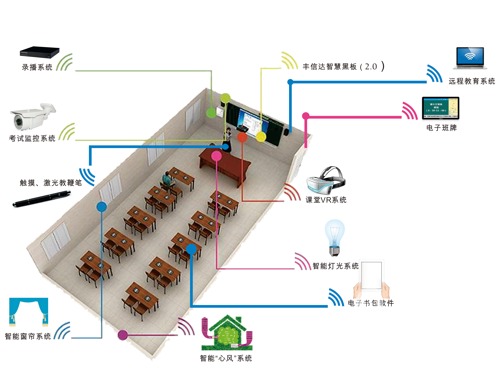 豐信達智慧教學綜合資源平臺由智慧黑板(2.0)顯示系統為主要載體,承接智慧教室各種資源平臺相結合而成。其中包括:先進的第二代智慧黑板教學設備、教室錄播系統、智能燈光系統、智能窗簾系統、智能“心風”系統、課堂VR系統、電子班牌、電子書包、考試監控等系統、以及各種課程專業教學應用軟件等系統組成。