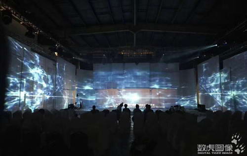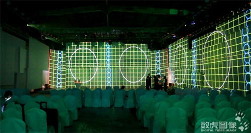 開幕式現(xiàn)場搭建了多層結(jié)構(gòu)的投影幕,通過13臺20000流明投影機,投影呈現(xiàn)一個半包裹式舞臺視覺框架。