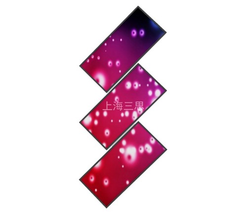 本次展會上,三思將為大家展示最新設計的創意LED櫥窗屏,將LED顯示屏玩出了“新花樣”,三塊高清小間距LED顯示屏“傾斜”組合在一起,但屏幕顯示的畫面卻非常“端正”。屏幕旋轉任意角度,所展示的畫面始終與人眼正視觀看水平線保持平行,這種獨具時尚魅力的LED顯示屏特別適合現場直播。