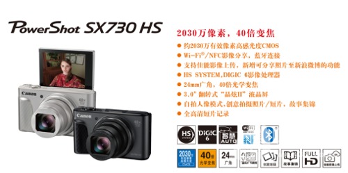 2017年4月6日,佳能(中國(guó))有限公司宣布推出小型數(shù)碼相機(jī)新品PowerShot SX730 HS。PowerShot SX730 HS具有40倍光學(xué)變焦能力,以及適合人像自拍的可向上翻轉(zhuǎn)180°的液晶監(jiān)視器。此外,用戶(hù)可通過(guò)Wi-Fi、NFC以及藍(lán)牙等多種方式對(duì)影像進(jìn)行無(wú)線(xiàn)傳輸和分享,收獲更多影像樂(lè)趣。對(duì)于在中國(guó)大陸地區(qū)購(gòu)買(mǎi)的佳能(中國(guó))有限公司出貨的佳能原裝正品,該機(jī)還具有佳能影像上傳功能,能夠上傳至百度網(wǎng)盤(pán),此外新增通過(guò)新浪微博分享照片的功能,拓展了其使用范圍。