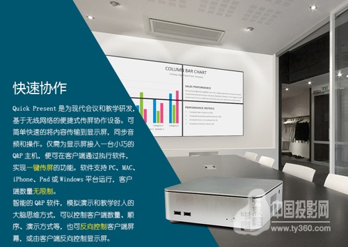 隨著網絡技術的飛速發展,無線傳屏設備開始興起,應用范圍非常廣泛。通過網絡連接,可建立多點多地的遠程視頻會議、辦公寫作、遠程培訓等,滿足不同地域、不同區域的各級別之間的高效率召開日常會議、學習培訓、技術交流、即時通訊等活動。