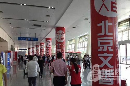 在主入口上方,北京文香紅色廣告牌與主辦方紅色遙相呼應,甚是顯眼。